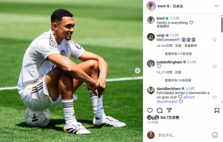 贝克汉姆用西语评论阿诺德ins:恭喜朋友加入一支伟大的俱乐部