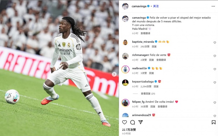 9月21日讯 皇马在本轮西甲焦点战2-0力克西班牙人,卡马文加最后时刻登场完成复出。他也在赛后通过社媒晒出自己的比赛照,...