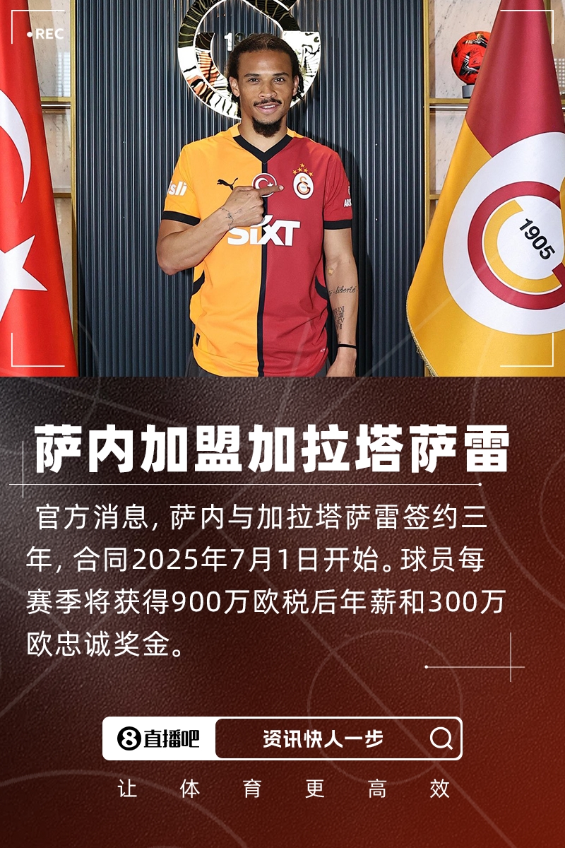 官方:萨内自由身加盟加拉塔萨雷,税后年薪900万欧+300万欧奖金