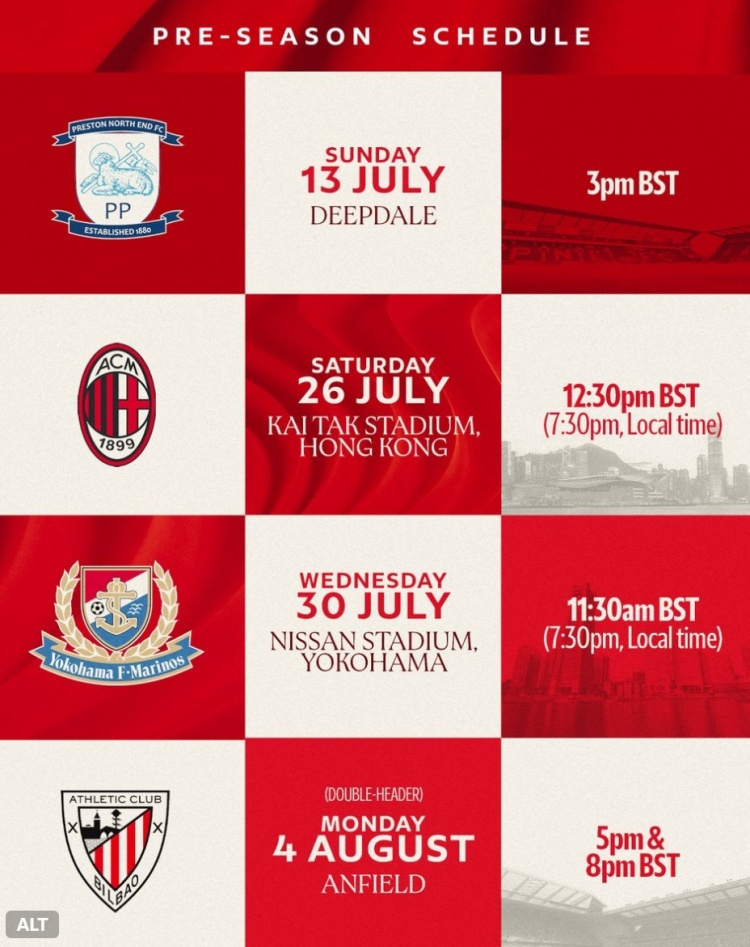利物浦公布季前赛赛程:对阵普雷斯顿、米兰、横滨水手和毕尔巴鄂