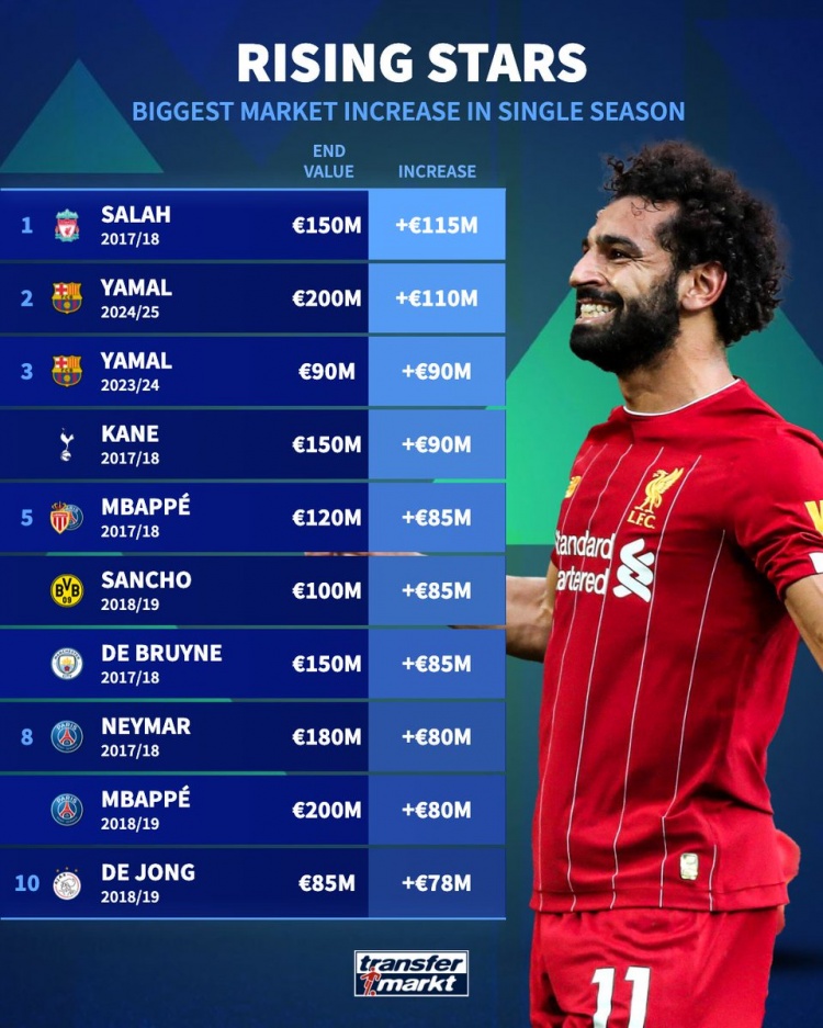德转球员单赛季身价增幅榜:萨拉赫1.15亿欧居首,亚马尔第二