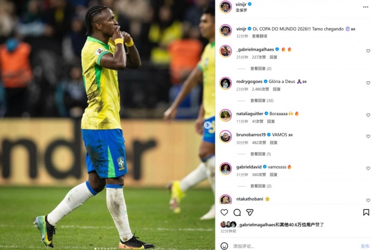 打入制胜球,维尼修斯社媒晒庆祝照:世界杯我们来了!