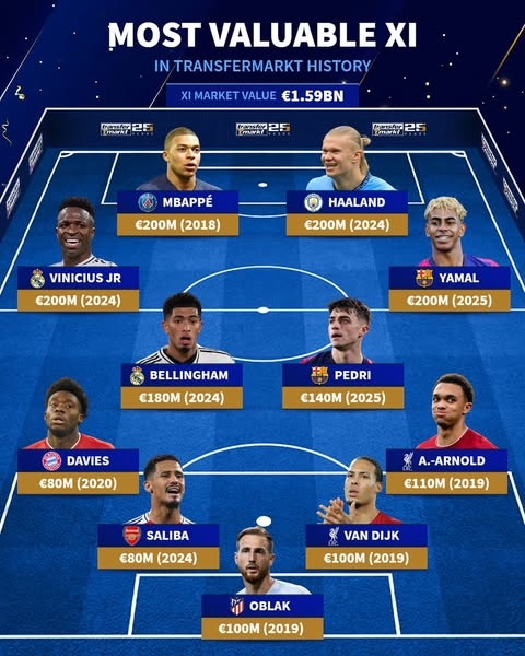 06月11日讯 德转在25周年之际列出网站历史身价最贵阵容,哈兰德、姆巴佩、亚马尔、维尼修斯以2亿欧领衔。德转历史最贵阵...