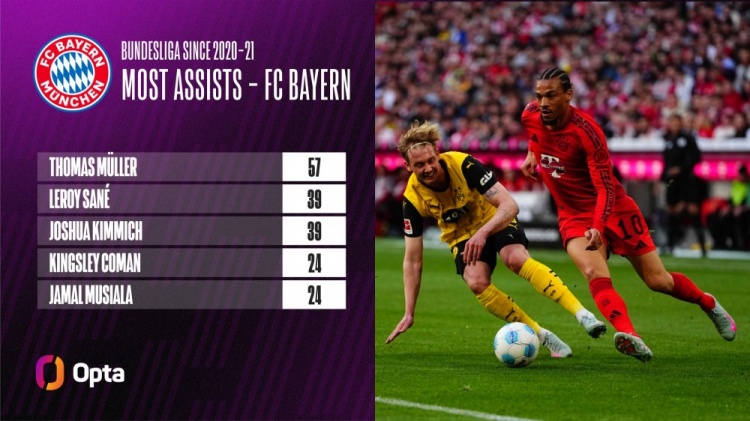 自加盟拜仁以来萨内德甲送出39次助攻,同期仅次于穆勒