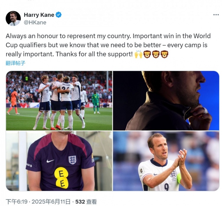 凯恩社媒:代表祖国出战始终是我的荣幸,我们深知需要做到更好