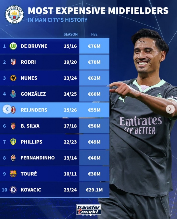6月11日讯 曼城官方宣布签下赖因德斯,德转也盘点了曼城队史引进中场球员花费榜,其中赖因德斯5500万欧(固定转会费)排...