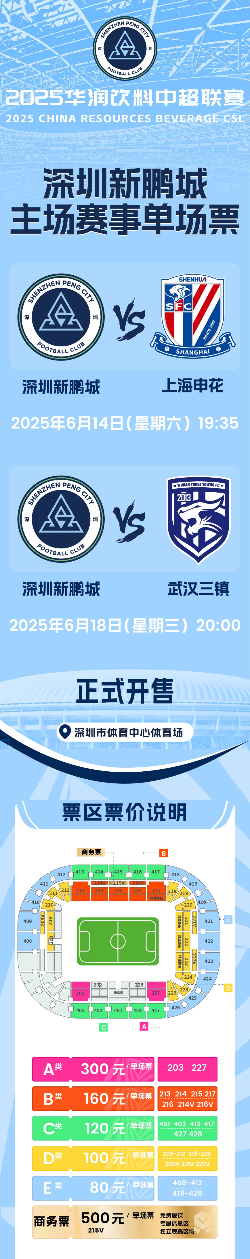 6月14日19:35,深圳新鹏城主场对阵上海申花6月18日20:00,深圳新鹏城主场迎战武汉三镇主场票务两场同开,正式开...
