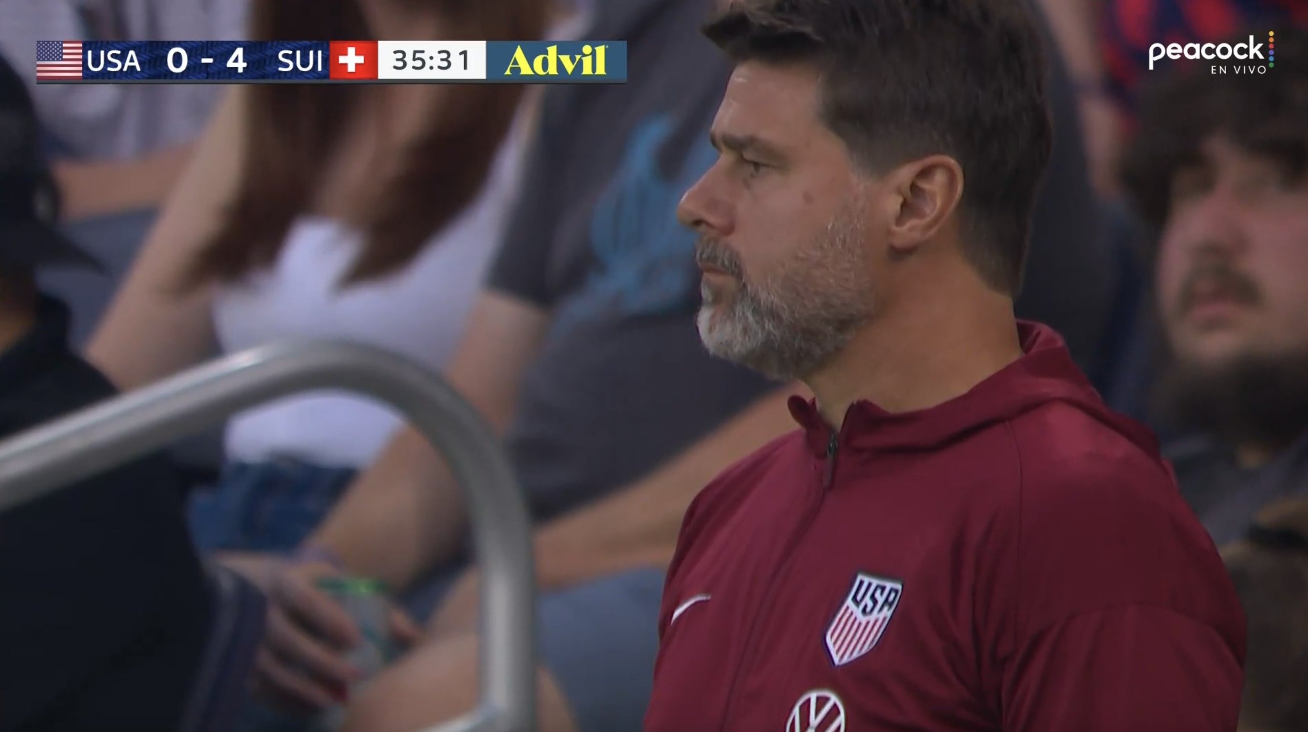 06月11日讯 足球友谊赛,美国vs瑞士。上半场第36分钟,瑞士队已经取得了4-0领先,打崩了美国。场边美国主帅波切蒂诺...