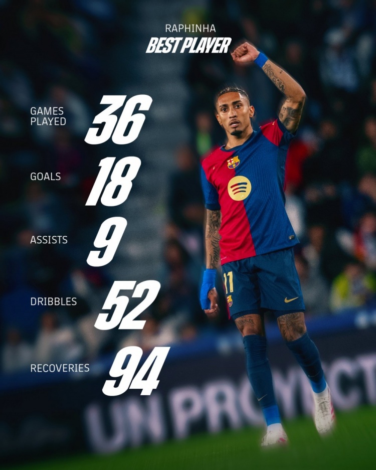 巴萨晒拉菲尼亚本赛季西甲数据:36场18球9助,完成52次过人