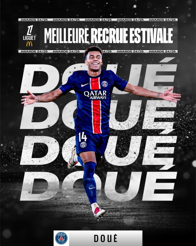 官方:巴黎前锋杜埃当选2024-2025赛季法甲夏窗最佳引援