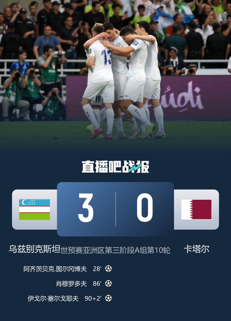 马宁执法!乌兹别克3-0卡塔尔暂升第一 18强赛6胜3平1负收官