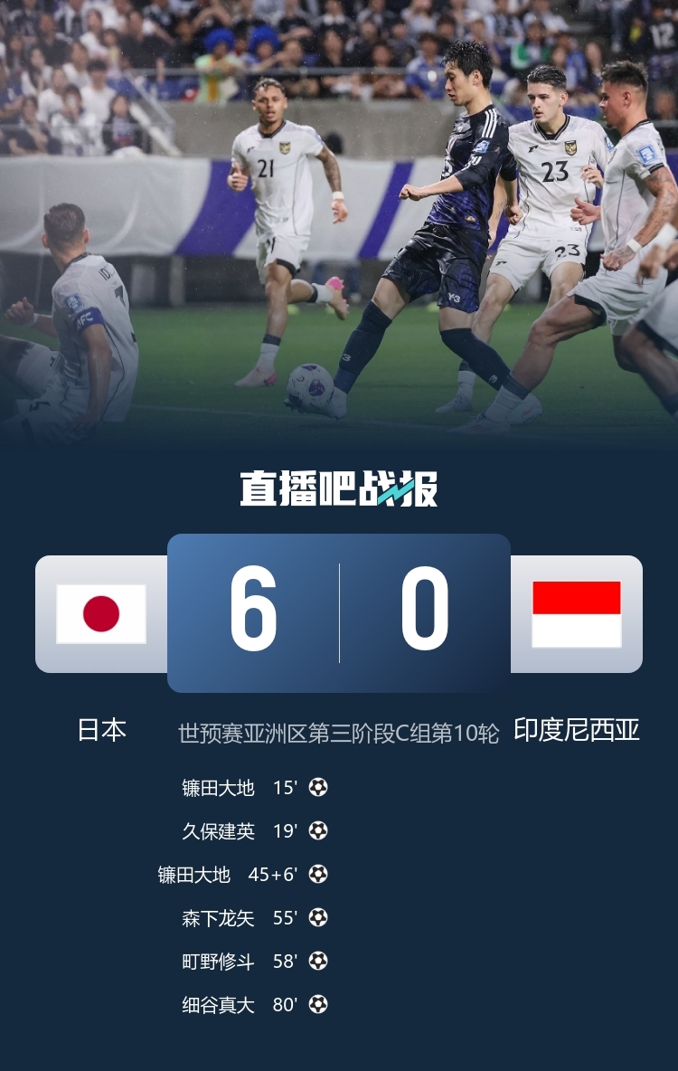 6月10日讯 18强赛收官战,日本队主场6-0大胜印尼队,全场比赛日本队完全压制对手,印尼队甚至0射门。赛后媒体人马克欣...