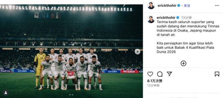 6月10日讯 18强赛收官战,印尼队客场0-6惨败日本队,不过他们还是获得了附加赛参赛资格。赛后印尼足协主席托希尔更新社...