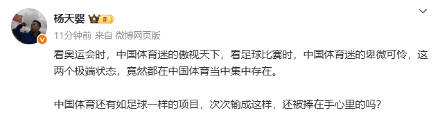 媒体人:看奥运时傲视天下和看足球比赛的卑微可怜,竟能集中存在