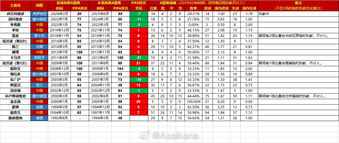 06月10日讯 德转管理员朱艺总结了近三十年中国男足主教练执教成绩 (图片来自@朱艺),可以看到执教10场以上的教练中,...
