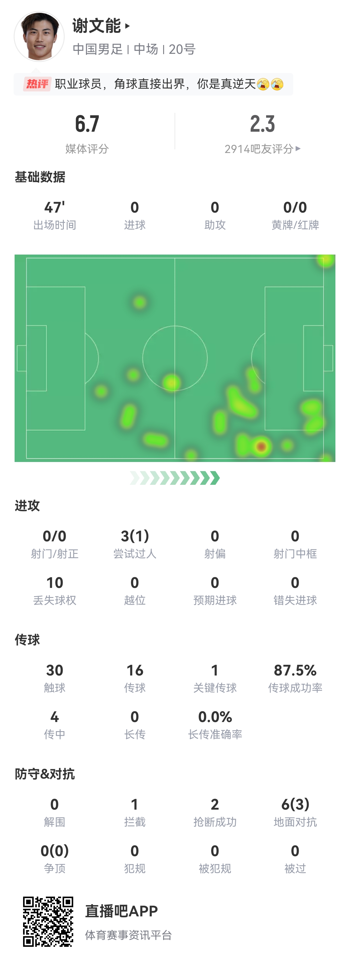 06月10日讯 北京时间19:00,世预赛亚洲区第三阶段C组第10轮,中国男足对阵巴林,谢文能半场数据出炉。0射门3次尝...