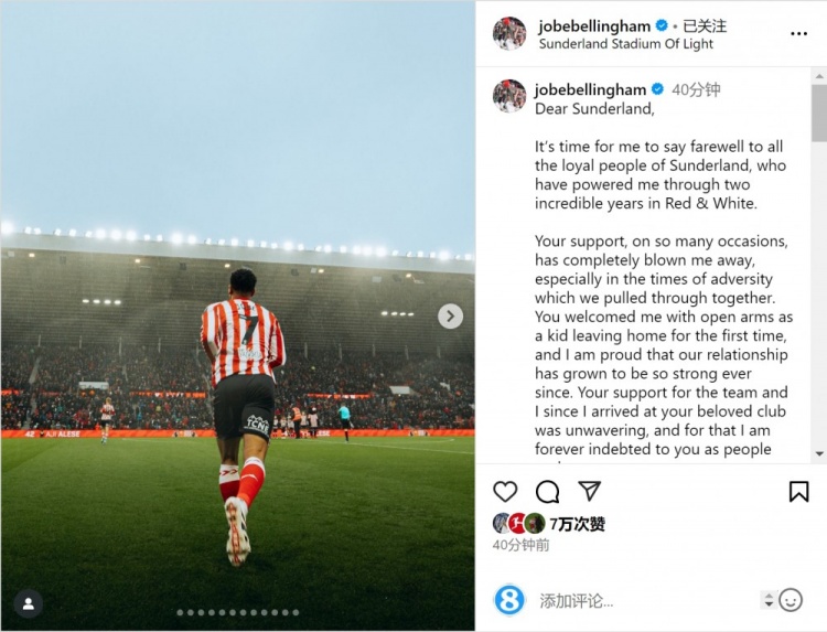 加盟多特!小贝林厄姆社媒告别桑德兰:永远感谢球迷的支持