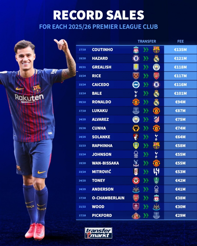 6月10日讯 德国转会市场盘点了2025-26赛季20支英超参赛队伍的历史最贵球员出售纪录,库蒂尼奥的1.35亿欧元至今...