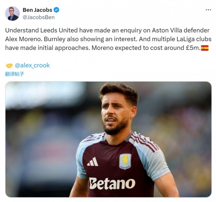 记者:利兹联接触维拉边卫莫雷诺,贝蒂斯、皇社、伯恩利也在关注
