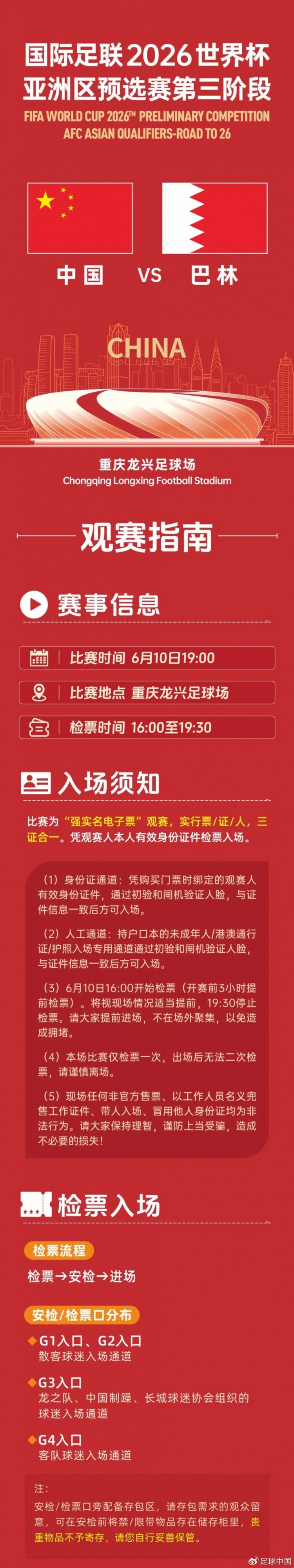 6月10日讯 今晚19:00,国足将在18强赛末轮对阵巴林,为了确保赛事的顺利进行,“足球中国”官方为观赛球迷提供了本场...