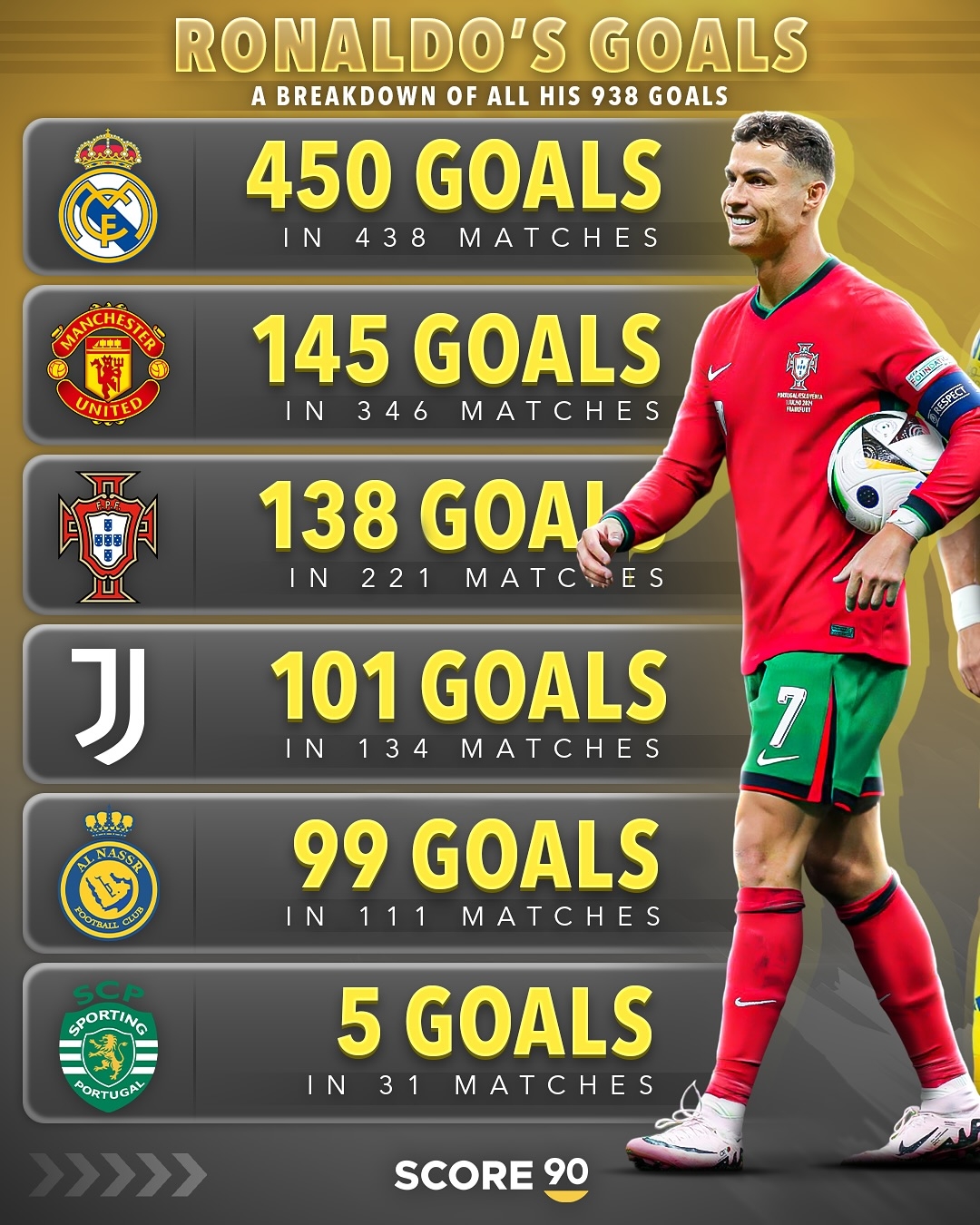C罗生涯938球:皇马 438场450球曼联 346场145球葡萄牙国家队 221场138球尤文 134场101球利雅得...