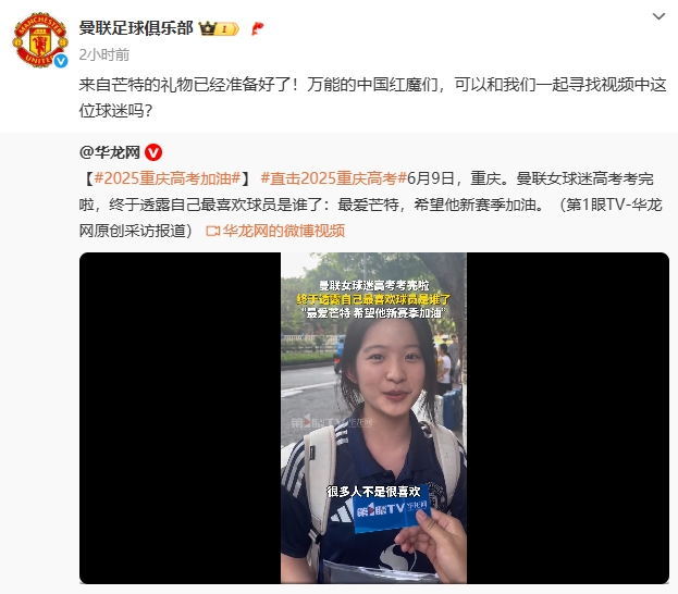 曼联官博全网寻人!重庆女球迷结束高考:最喜欢的球员是芒特