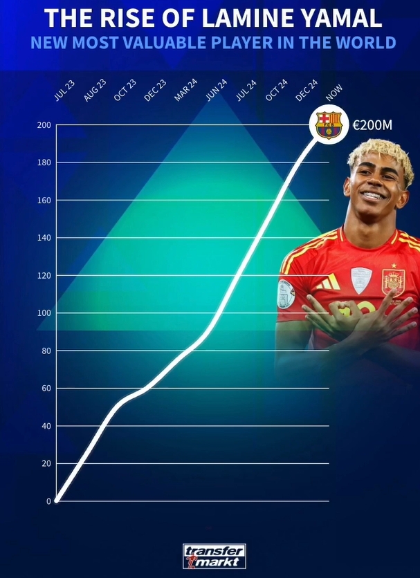 德转昨日更新西甲球员身价,17岁亚马尔身价涨到2亿欧,达到足坛历史第一身价!德转发布亚马尔身价变化视频,亚马尔刚满16岁...