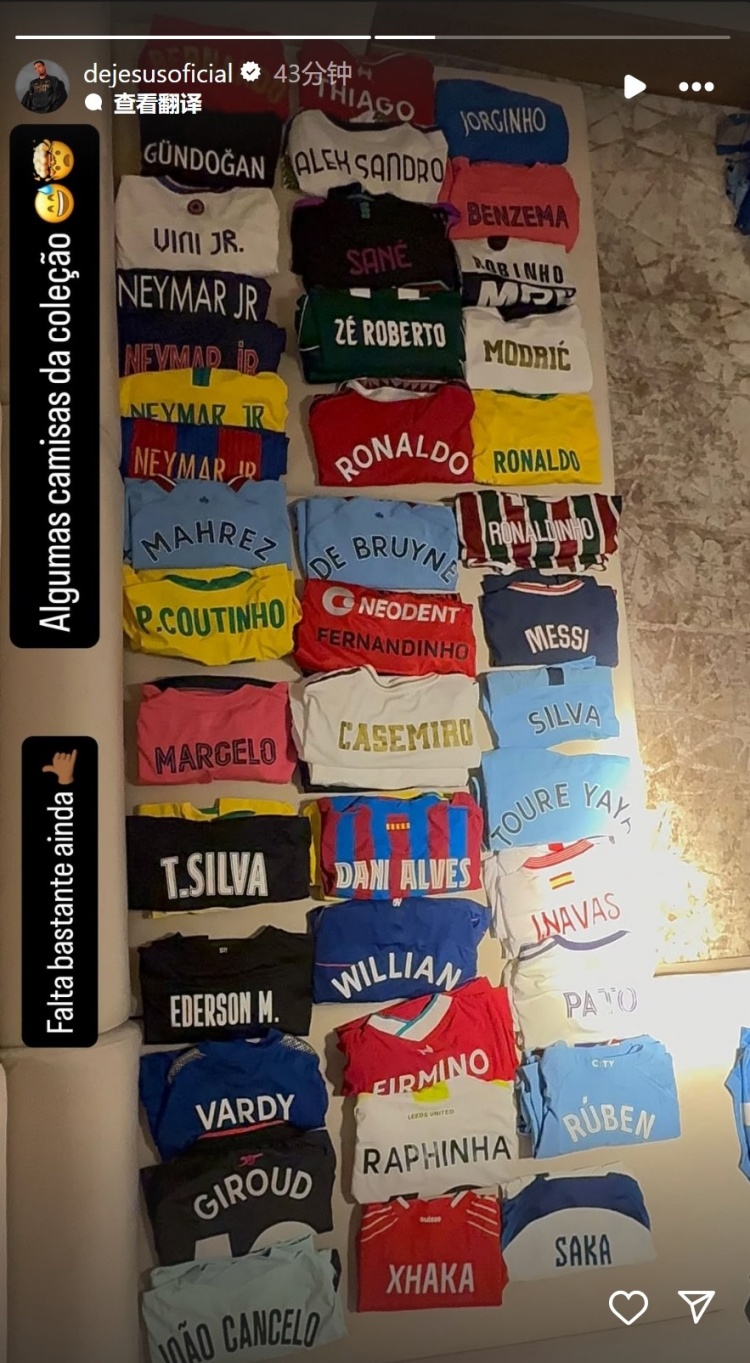 热苏斯社媒晒球衣收藏:梅西、C罗、内马尔、小罗球衣在列