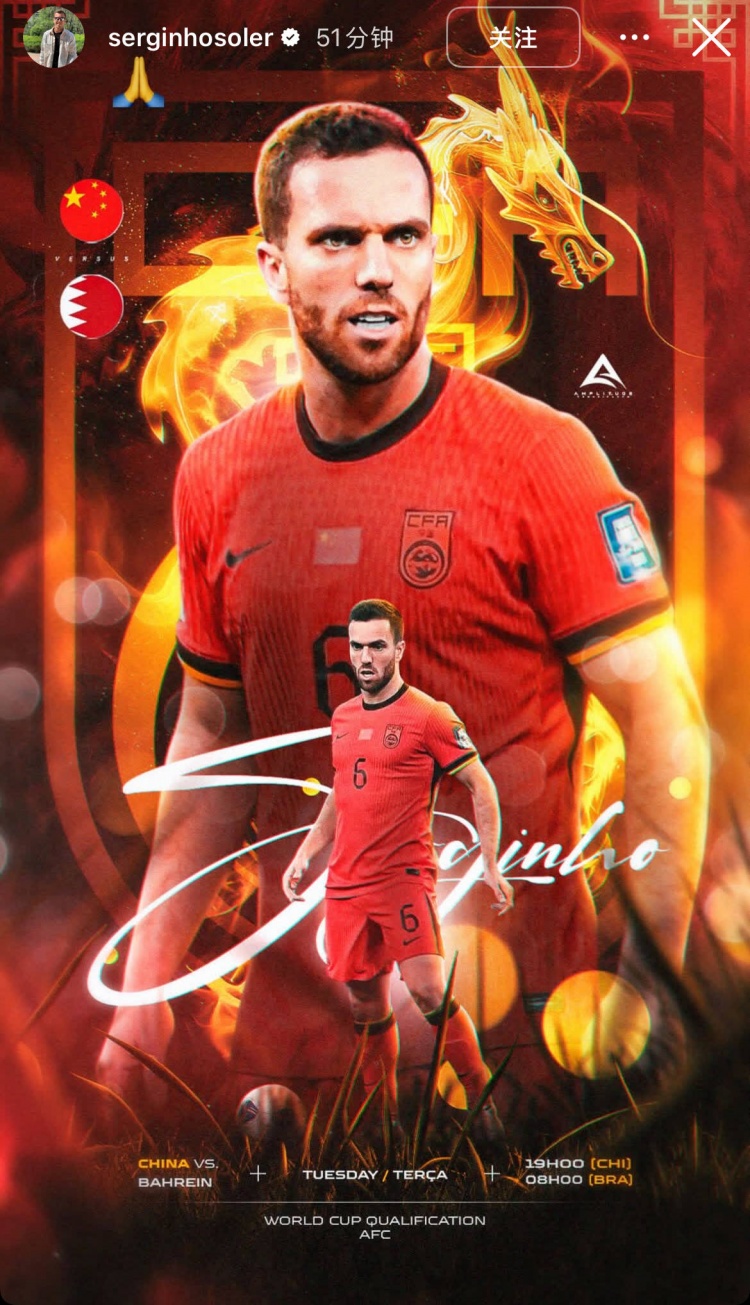 今晚能否首发?塞尔吉尼奥更新社媒,晒出国足vs巴林队的个人海报