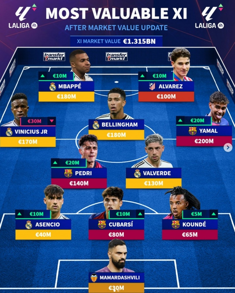 德转列更新后西甲最贵阵:亚马尔领衔,姆巴佩、贝林厄姆在列