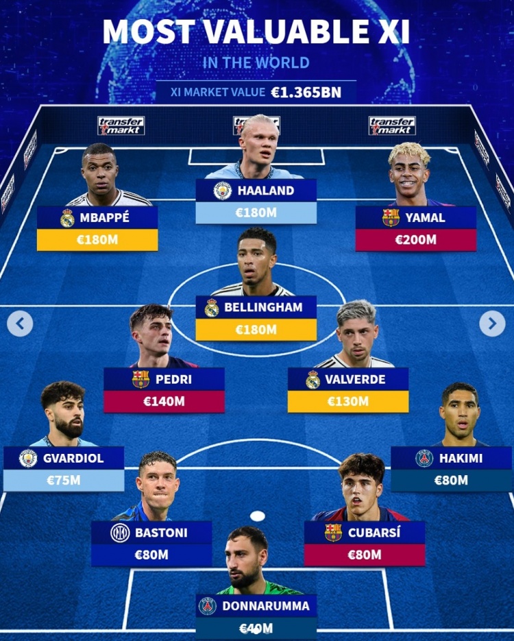 德转公布最贵球员阵容:亚马尔2亿领衔,姆哈、贝林厄姆1.8亿欧