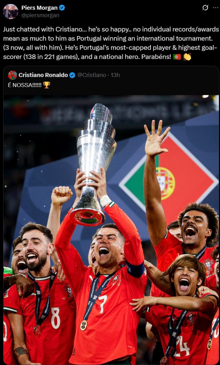 6月9日讯 在欧国联决赛,葡萄牙击败西班牙夺冠,C罗再次破门。C罗拥趸摩根转发了C罗庆祝夺冠的社媒,配文写道:“刚刚与C...