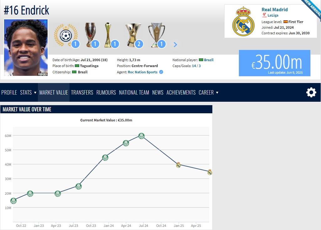 遇瓶颈!18岁恩德里克加盟皇马后身价两连降,巅峰6000万现3500万