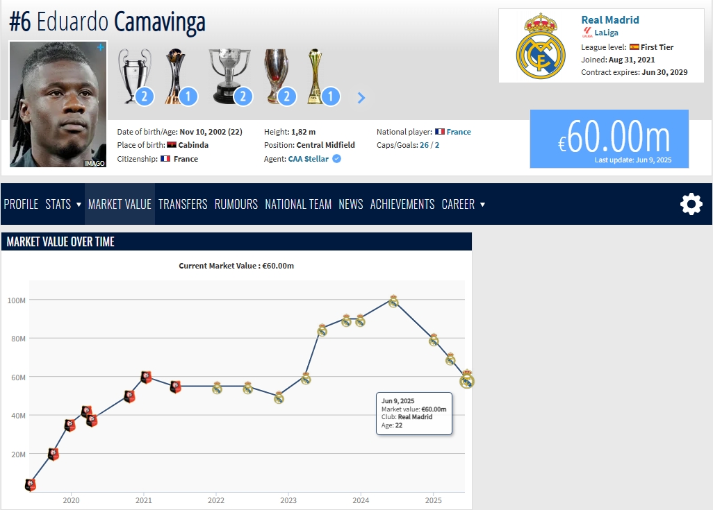 06月09日讯 德转更新西甲最新身价后,皇马中场卡马文加身价降至6000万欧,生涯首次身价三连降。卡马文加巅峰身价出现在...