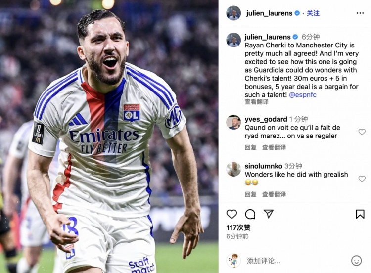 06月09日讯 罗马诺用标志性的here we go确认,曼城签下里昂21岁边锋切尔基。罗马诺表示:“切尔基即将加盟曼城...
