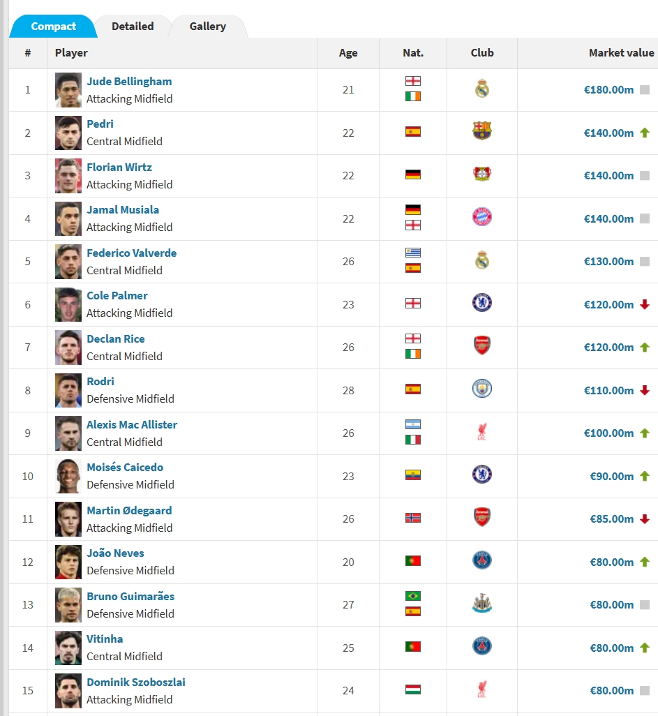 足坛中场身价前15:贝林1.8亿欧 佩德里&维尔茨1.4亿 麦卡1亿