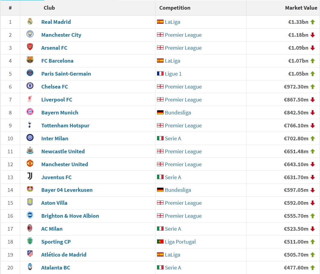 俱乐部身价排名:皇马领衔5队超10亿欧,利物浦第7,曼联第12