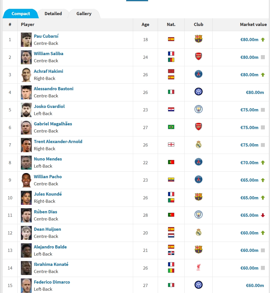 足坛后卫身价:库巴西8000万第一 阿诺德7500万 门德斯7000万