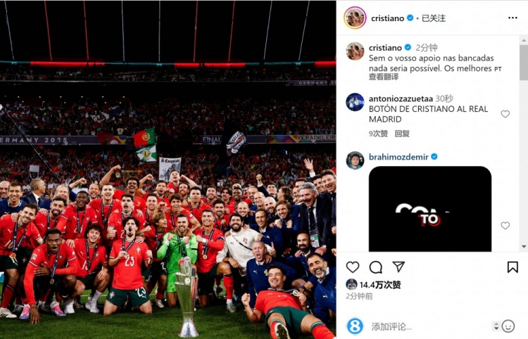 问鼎欧国联!C罗社媒致谢球迷:没有你们的支持,这一切无法实现