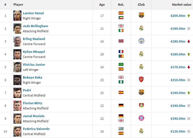 全球足坛前十身价:亚马尔2亿领跑,西甲占6席,哈兰德、萨卡入列