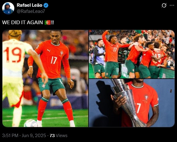 6月9日讯 今天凌晨,葡萄牙击败西班牙夺得欧国联冠军,莱奥赛后在社交媒体发文庆祝。莱奥晒出了几张赛场照,并配文:“我们再...