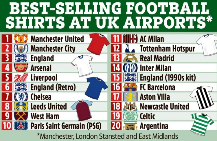 太阳报统计英国机场球衣销量:曼联第一,曼城第二