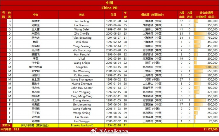 世界杯预选赛中国、巴林国家队本比赛日集训大名单人数:中国25:巴林26平均年龄:中国28.2:巴林29.2总身价:中国1...