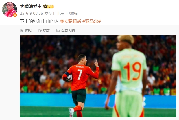 韩乔生晒40岁C罗和17岁亚马尔同框图:下山的神和上山的人🌟