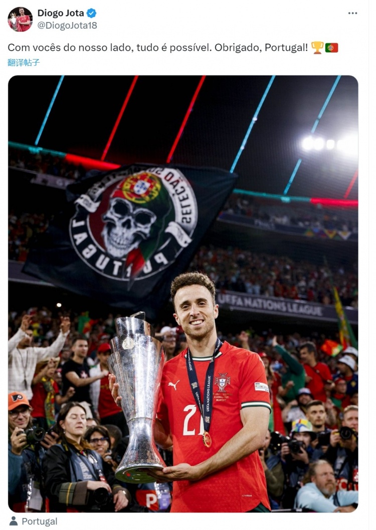 若塔晒与奖杯合照致谢球迷:有你们的支持,一切皆有可能