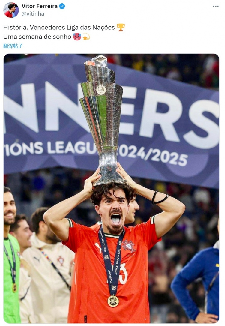 问鼎欧冠+欧国联!维蒂尼亚社媒:这是梦幻的一周