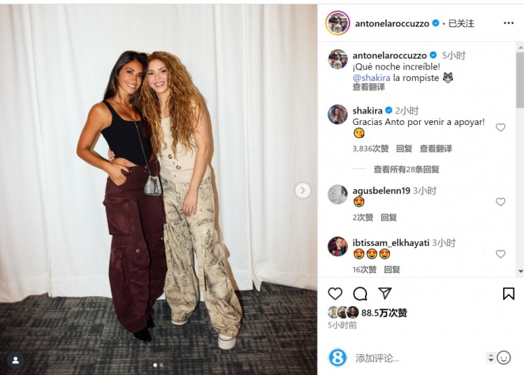 观看演唱会!安东内拉晒与夏奇拉合照:美妙的夜晚,你太炸了🐺