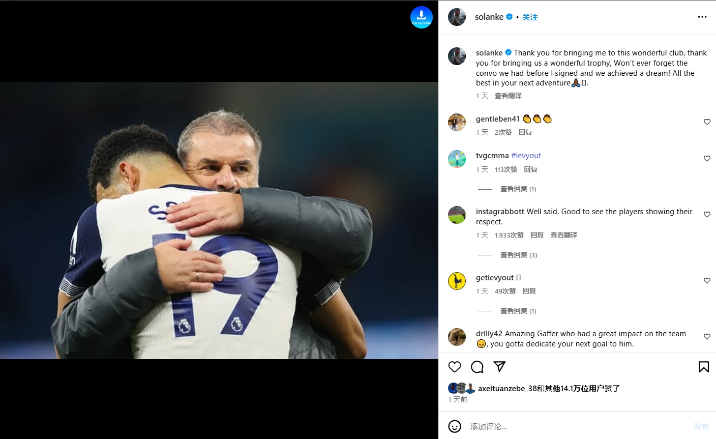 6月8日讯 热刺前锋索兰克在个人社媒晒出一张与前主帅波斯特科格鲁的拥抱合影,为其送上告别。索兰克写道:“感谢您把我带到这...