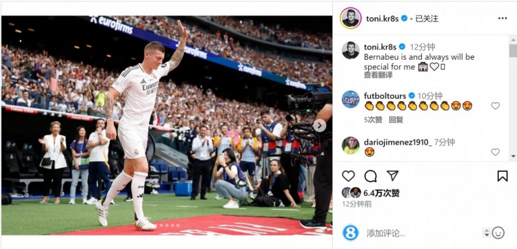 传奇赛点射破门!克罗斯社媒:伯纳乌对我来说永远都是特别的