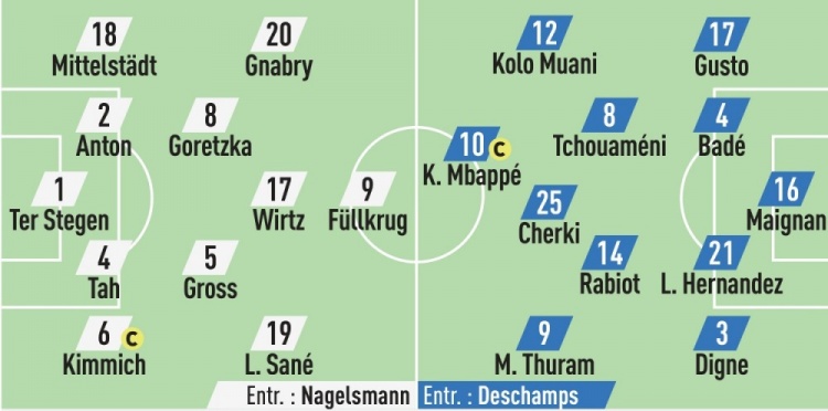 队报预测德国vs法国首发:基米希右后卫,维尔茨先发,姆巴佩出战